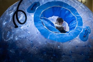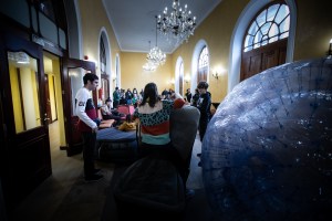 En la presentación fue tan importante escuchar a Tania contar la implicación performativa de trabajar sobre grandes hinchables (intervenidos, con flautas o armónicas al término de los tubos por donde se hinchan, de manera que el aire que escapa de ellos los hace sonar de distintas maneras) como pasar directamente a la práctica. Y la sorpresa y la risa fueron generales al ver cómo PuzzleAtípico, sin dudarlo un segundo, se lanzaba sobre las camas de aire, haciendo sonar una melódica, exprimía otro colchón para sacar pitidos de una flauta o se metía en el interior de una gran esfera, meciéndose por la inercia y también por los empujes de las personas que quedaban fuera. Un mundo de posibilidades creativas que PuzzleAtípico tendrá por explorar a partir de ahora, que es solo comparable a ese otro mundo de posibilidades por explorar abierto por estas Jornadas. Ese que íntimamente sentimos todas las personas implicadas y reunidas al ver que un encuentro de tal magnitud no solo era posible, sino necesario. Por eso no dejaremos de decir gracias, mil gracias, a toda la gente que hace todo esto posible, estando, y aún sin poder estar, formando parte o acompañándonos, aisitiendo a este encuentro y haciéndonos aprender compartiendo sus propios planteamientos. Gente que no sabe estar de otra manera que dando, porque para eso estamos aquí. Desde el propio grupo a las representantes políticas o institucionales. Desde las amigas y compañeras de sectores como el artístico, el educativo o el de la salud, a los familiares y allegados, tanto de PuzzleAtípico como del resto de proyectos que han querido encontrarnos ahora.