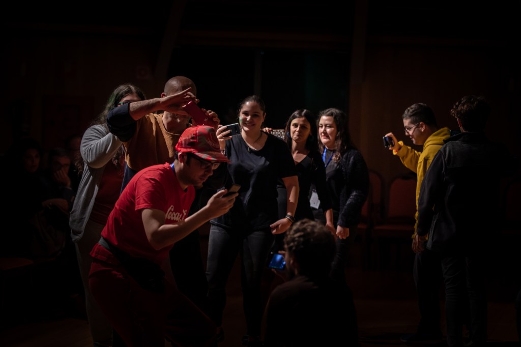 Tal vez tomó por sorpresa a parte del público que PuzzleAtípico no comenzara su restrospectiva hablando, como se había hecho hasta ese momento, sino rompiendo la dinámica con una acción performativa que ilustran las imágenes anteriores, realizada a ritmo de cumbia a partir de ejercicios combinados de diferentes temporadas. Al acabar, entonces sí, el grupo ocupó la mesa de presentación para continuar su retrospectiva, combinando alegremente los formatos de conferencia, comunicación y conversación. Para ello, una selección de vídeos realizados en cada temporada daba paso al relato de los procesos creativos que los habían hecho posibles, siempre matizados y complementados por todas las voces, sin un discurso único, sino construido en el propio momento, a partir de unas bases comunes. Distintas conversaciones para hablar de aprendizaje, el artístico y el grupal y vivencial. De técnicas y estéticas a la hora de realizar vídeos, y de la relación indisociable entre unas y otras. De dificultades y superaciones. Y de algunas preguntas encontradas y ciertas respuestas sobre la identidad grupal e individual. Un recorrido que sirvió para dar una imagen de conjunto a quienes conocían más o menos a PuzzleAtípico, y también para aquellas personas que lo encontraban por primera vez.