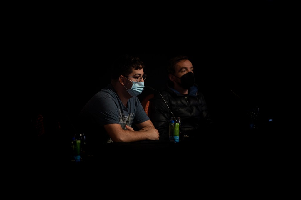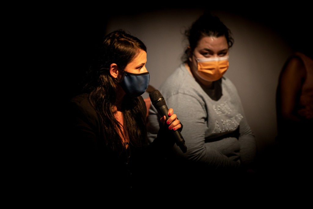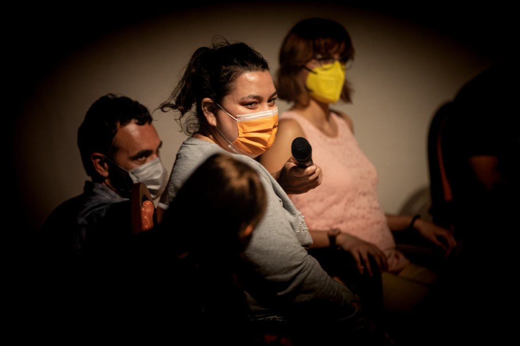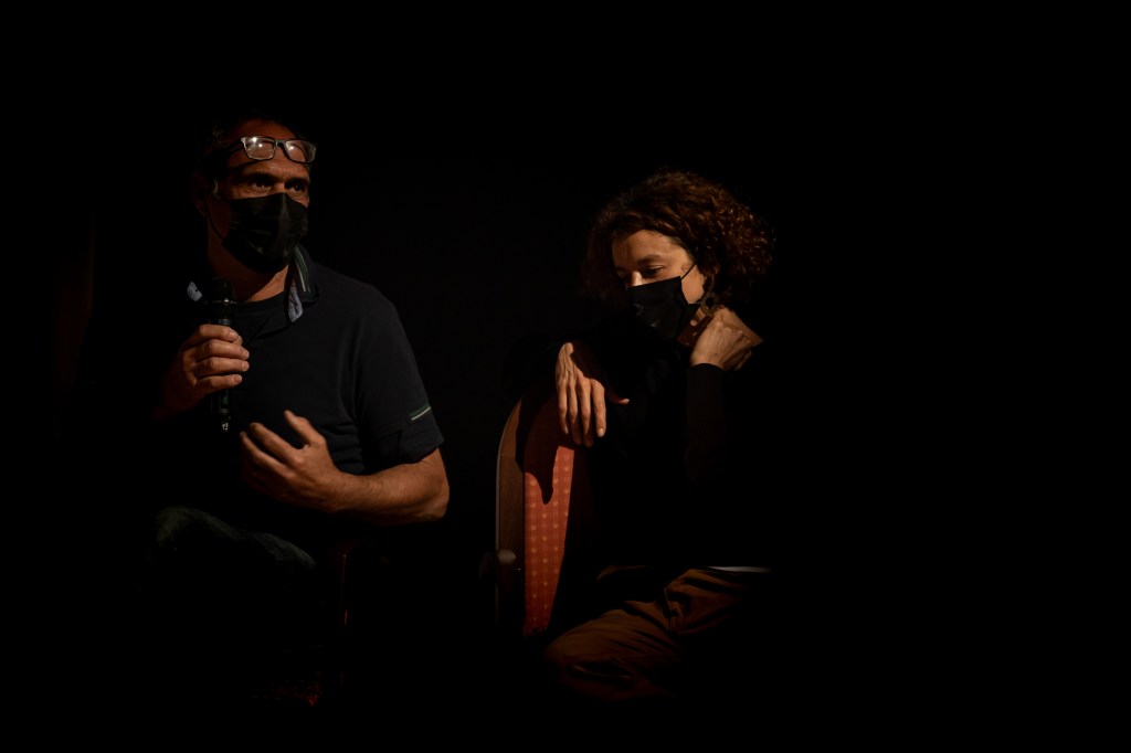 A partir de la lógica anterior, llegó el turno de PuzzleAtípico, representado por algunas de las personas que lo hemos venido integrando, esta vez en nombre del grupo entero, incluyendo las nuevas incorporaciones de esta nueva temporada. Un momento para rememorar el trabajo realizado en la Temporada 4 junto a Tania García y su Concierto para viento. Una propuesta atravesada por la irrupción de la cuarentena. Dado esto, fue importante poder compartir en persona las implicaciones de ese trabajo sobre el sonido. El modo forzoso en el que aquel proceso hubo de adaptarse a una situación antes impensable. El empeño en mantenernos en contacto durante esos meses difíciles. E incluso, el giro inesperado. El modo en el que la propuesta de Tania, con una voluntad de conjunto, consiguió adaptarse a lo nuevo y lo restringido. Tanto, que repasar la memoria conjunta junto a algunos vídeos resultantes de ese trabajo, proyectados a lo grande, nos reafirmamos al decir que Concierto para viento salvó nuestro confinamiento. Nos hizo atravesarlo a través de la determinación y paciencia de quienes se comprometen en un proceso creativo sabiéndose parte de algo más. Un proceso de acompañamiento colectivo en esos meses de silencio raro, que invertimos en escuchar los sonidos de una vida cotidiana alterada, registrarlos con nuestros móviles y compartirlos en forma de dos piezas: Diario sonoro del confinamiento y Concierto místico experimental, ambas disponibles en esta página.