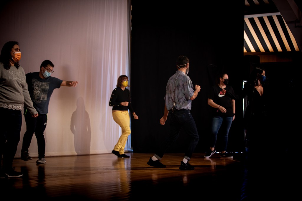 La adaptación aquí también hubo de integrar las medidas sanitarias. Por eso este Parlamento del Futuro fue realizado esta vez solo con integrantes de PuzzleAtípico, a un mismo nivel de escenario, con amplias distancias de seguridad, no como regularmente se ha venido ofreciendo desde 2020. Normalmente, para su realización, una intervención espacial enfrenta dos tarimas en las que, también con distancia de seguridad, jóvenes entre 14 y 25 años encuentran su escaño en este parlamento de cuestiones y movimientos futuribles. En él, la música electrónica, siempre a cargo del Coelctivo Micromusic, ambienta y sube el ritmo para que los jóvenes cuerpos entren en tono desde sus estrados, a través de un calentamiento guiado que acaba por convertirse en una sesión (de electrónica) parlamentaria.